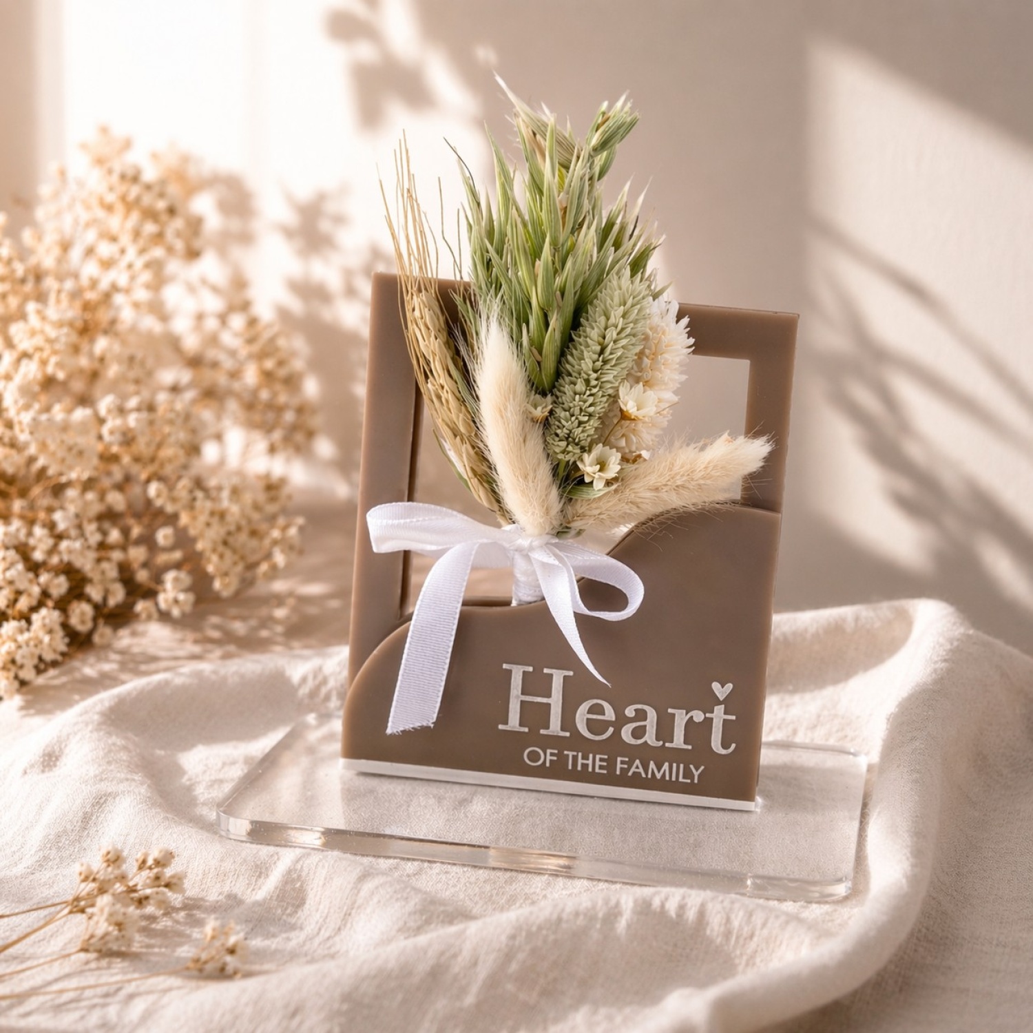 Featuring a delicate arrangement of dried florals, each piece is thoughtfully styled to create a soft, timeless look. Crafted from premium 3mm acrylic with a sturdy 6mm clear base, it’s made to stand beautifully on a bedside, shelf, or special space in her home.